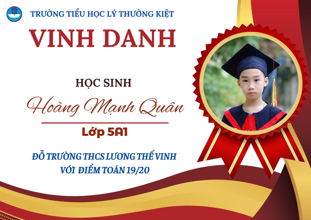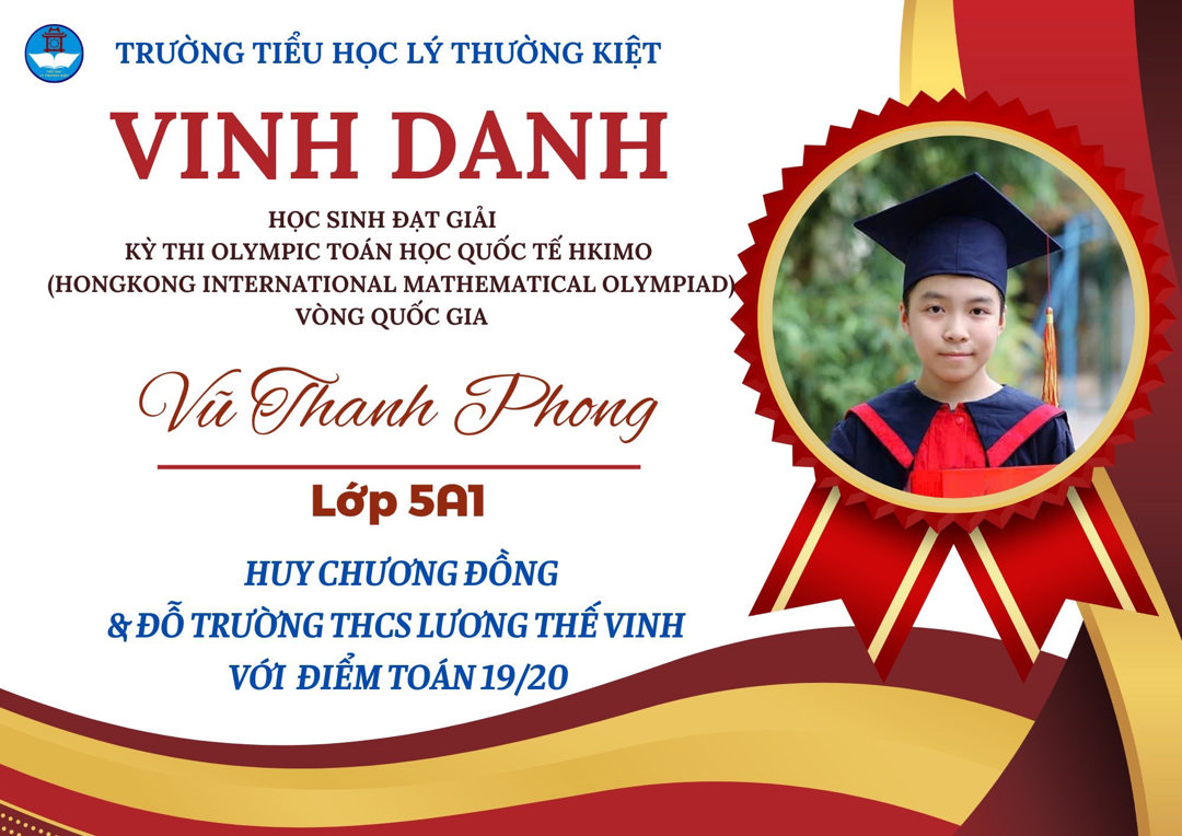 Vũ Thanh Phong – Lớp 5A1 - Huy chương Đồng, đồng thời đạt 19/20 điểm, trúng tuyển vào trường THCS Lương Thế Vinh