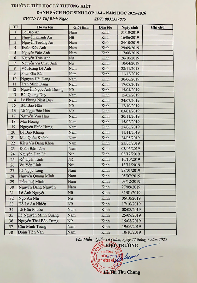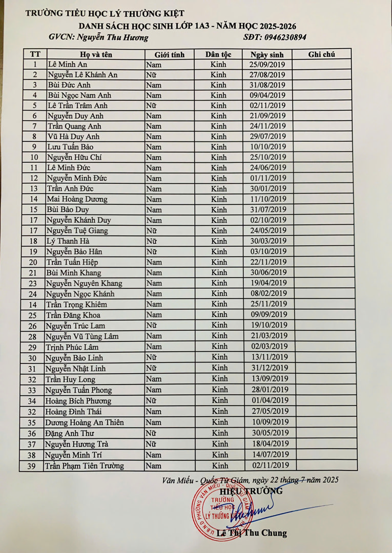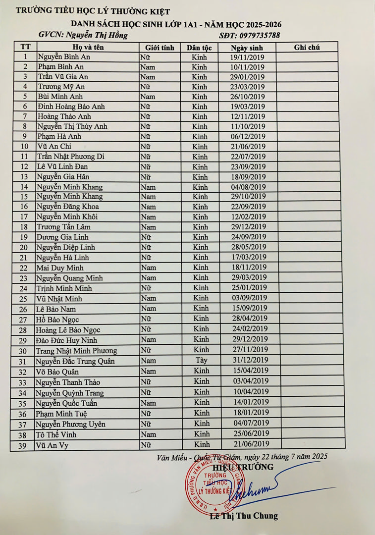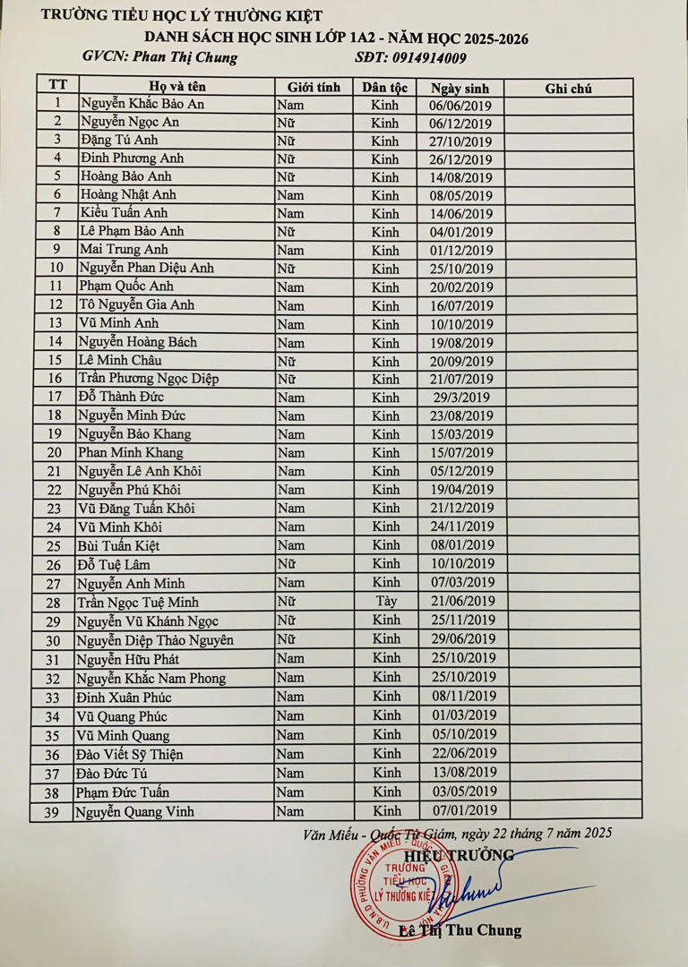 Danh sách học sinh lớp 1 năm học 2025-2026 theo từng lớp đã được niêm yết tại bảng tin nhà trường và đăng tải trên website chính thức.